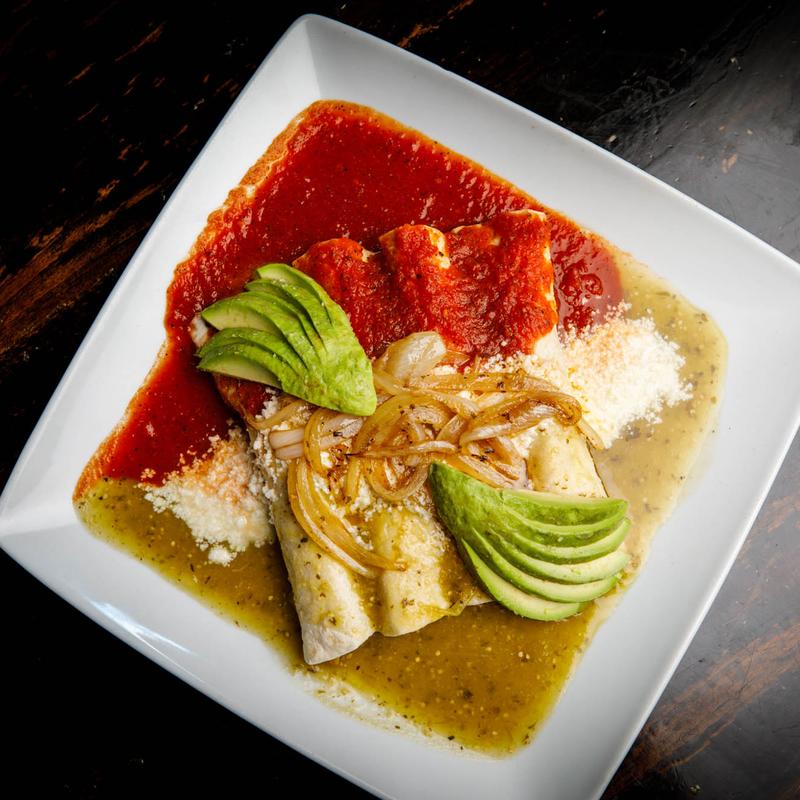 Four flour tortillas filled with shredded chicken. Topped with mild tomatillo salsa on one half and mild enchilada sauce on the other. Both sauces are divided by queso fresco, avocado, and grilled onions.