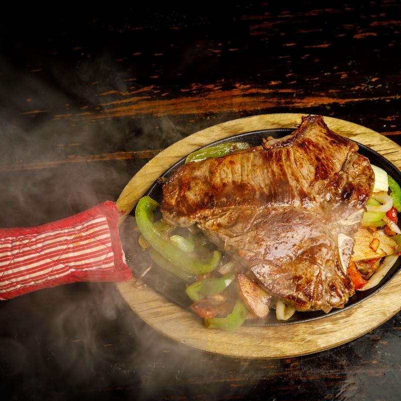 10 oz. T-bone steak grilled with bell peppers, onions, tomatoes, and mushrooms. Served with rice and beans or salad.