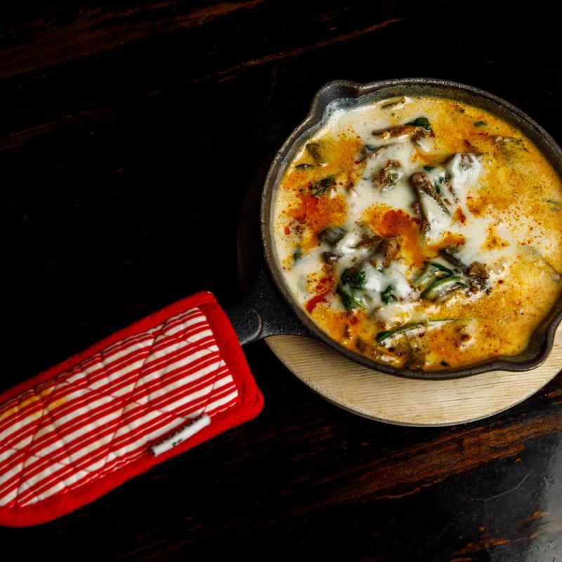 Chorizo, roasted poblano peppers, mushrooms and, two kinds of cheese all melted in a hot skillet.